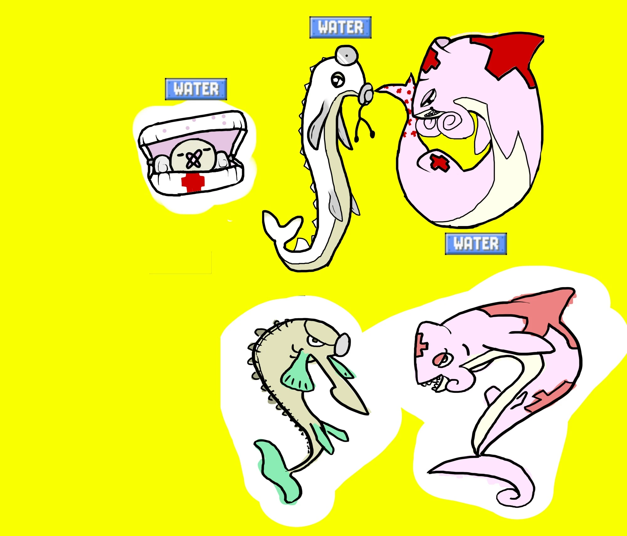 At one time, Nurshary was intended to evolve from a bivalve Pokémon that resembled a first aid kit, which could also evolve into a sturgeonsurgeon. However, Nurshary was the only one of the three to get enough support to be added to the Pokédex.